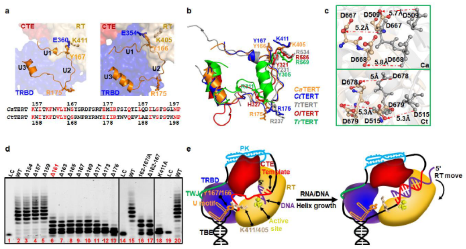 2021年4月,生物大分子结构与功能团队在《Nucleic Acids Research》发表研究型论文。阐明了在细胞衰老、癌症的出现和发展以及干细胞更新的能力中起着关键作用的端粒酶结构与功能。首次报道了来自白色念珠菌和热带念珠菌的端粒酶和复合体的结构。发现念珠菌 TERT 蛋白在存在或不存在 PK/TWJ 的情况下仅执行一轮端粒添加,并显示标准的逆转录酶活性。C-末端结构域采用至少两种极端构象并进行构象相互转换,从而调节催化活性。鉴定了尚未报道的一个保守的三级结构基序,命名为 U-基序,与逆转录酶域相互作用,对催化活性至关重要。