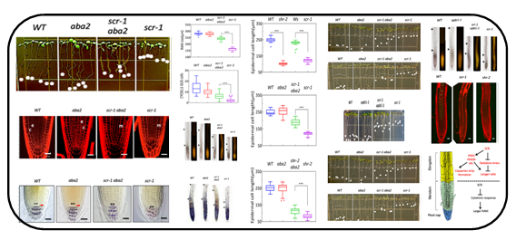 2021年5月,植物根发育与逆境发育生物学团队《The Plant Journal》在线发表研究型论文。该研究发现,scr突变体根的伸长区细胞活性氧积累,氧化还原的平衡受到了破坏。植物受到非生物胁迫可以引起ROS的积累,而ABA是参与非生物胁迫的主要激素。在scr突变体中引入ABA合成缺陷突变体aba2,发现提高了scr耐受氧化胁迫的能力,增强了分生区细胞的有丝分裂活性,增长了伸长区表皮细胞的长度,显著缓解了其短根的表型。在scr突变体中引入根部还原性较强的突变体upb-1也得到了类似的结果。进一步研究表明,scr伸长区中升高的过氧化氢含量主要是由于在伸长区特异表达的过氧化物酶基因Peroxidase3的表达下调引起。值得指出的是,在scr aba2和scr upb1双突中,scr突变体造成的干细胞巢和基本组织的缺陷依然存在,说明SCR促进根细胞伸长与维持干细胞通过不同的机制。该研究结果创新性地揭示了在根的发育中,SCR能不依赖SHR,而独立的通过协调氧化胁迫响应和氧化还原平衡来促进根细胞的伸长和分化,对于阐明植物非生物逆境胁迫响应与根生长发育的关系具有重要意义。