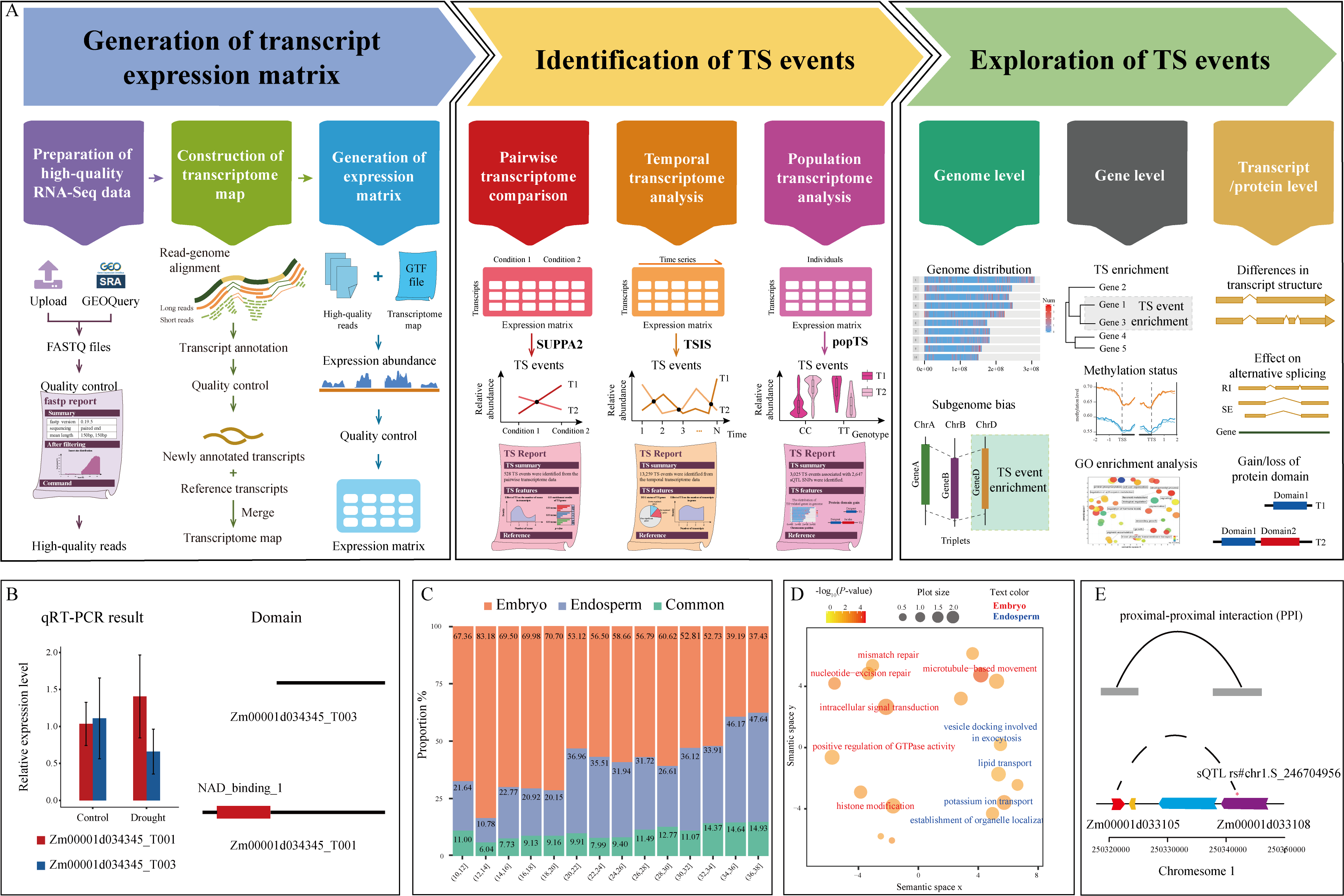 2021年5月,马闯教授团队在《Briefings in Bioinformatics》发表研究型论文。报道了一款从转录组数据中挖掘转录本转换(Transcriptional Switch; TS)事件及其关联遗传变异的生物信息学分析软件deepTS。基于玉米大规模转录组数据整合分析,发掘出500多个与干旱胁迫相关的TS事件;发现TS事件的发生具有较强的组织特异性;鉴定出2,600多个和TS事件关联的sQTL位点,部分sQTL可能通过染色质远程互作的方式影响下游基因表达,进而诱导TS事件的发生。deepTS的源码和Docker镜像文件可从https://github.com/cma2015/deepTS获取。