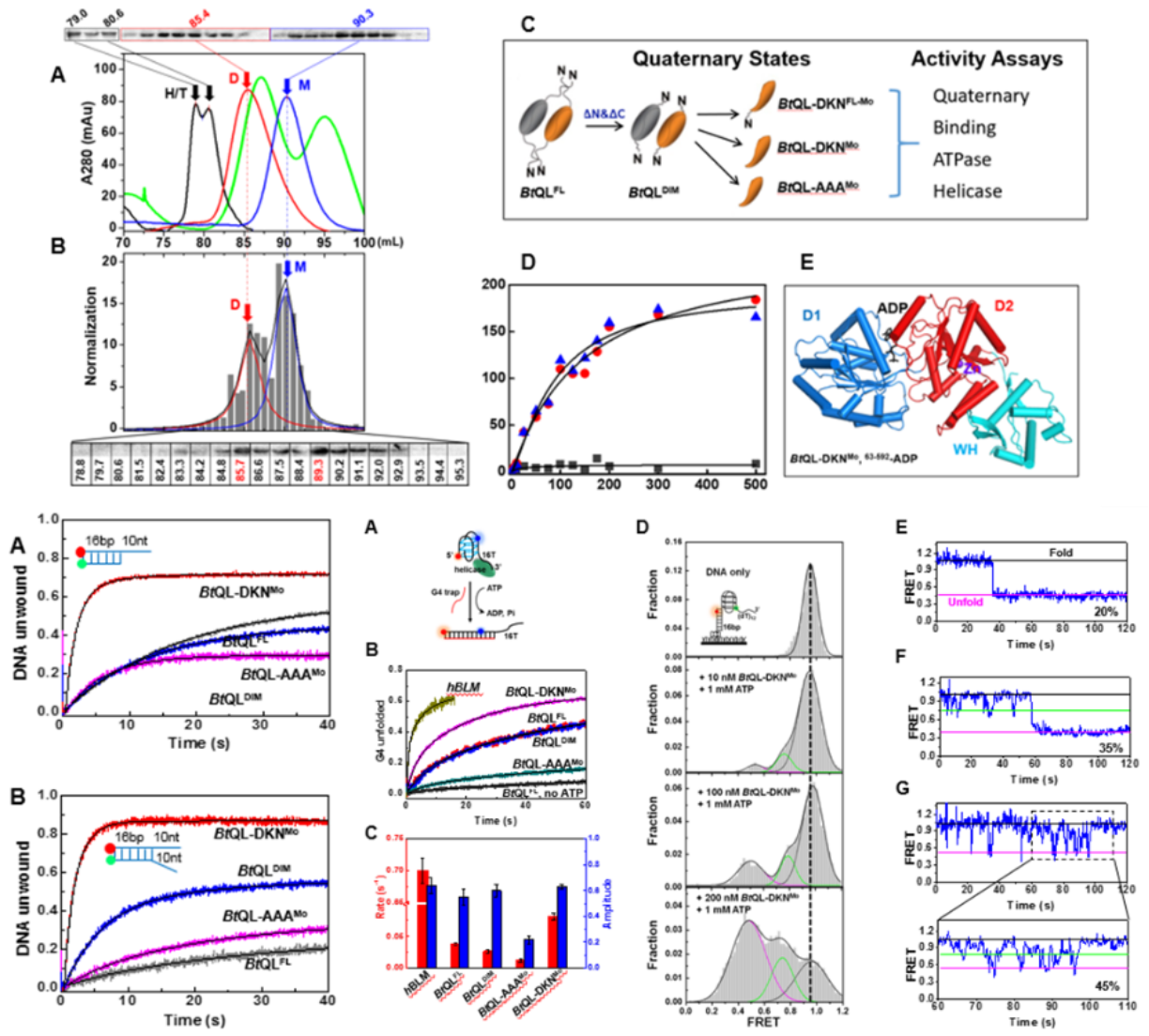 2021年9月,生物大分子结构与功能团队在《Cell Reports》发表研究型论文。报道了在活细胞中单体 RECQL解旋酶比寡聚体/二聚体形式更丰富,挑战了长期以来对单体 RECQL 功能的普遍认识。首次报道单体 RECQL可像BLM 解旋酶一样有效地展开分子内 G 四链体 DNA。这些发现对理解内源性 RECQL 寡聚结构及其调控具有重要意义,值得重新审视活细胞中 RecQ 家族解旋酶的其他成员的寡聚状态及调控机制。