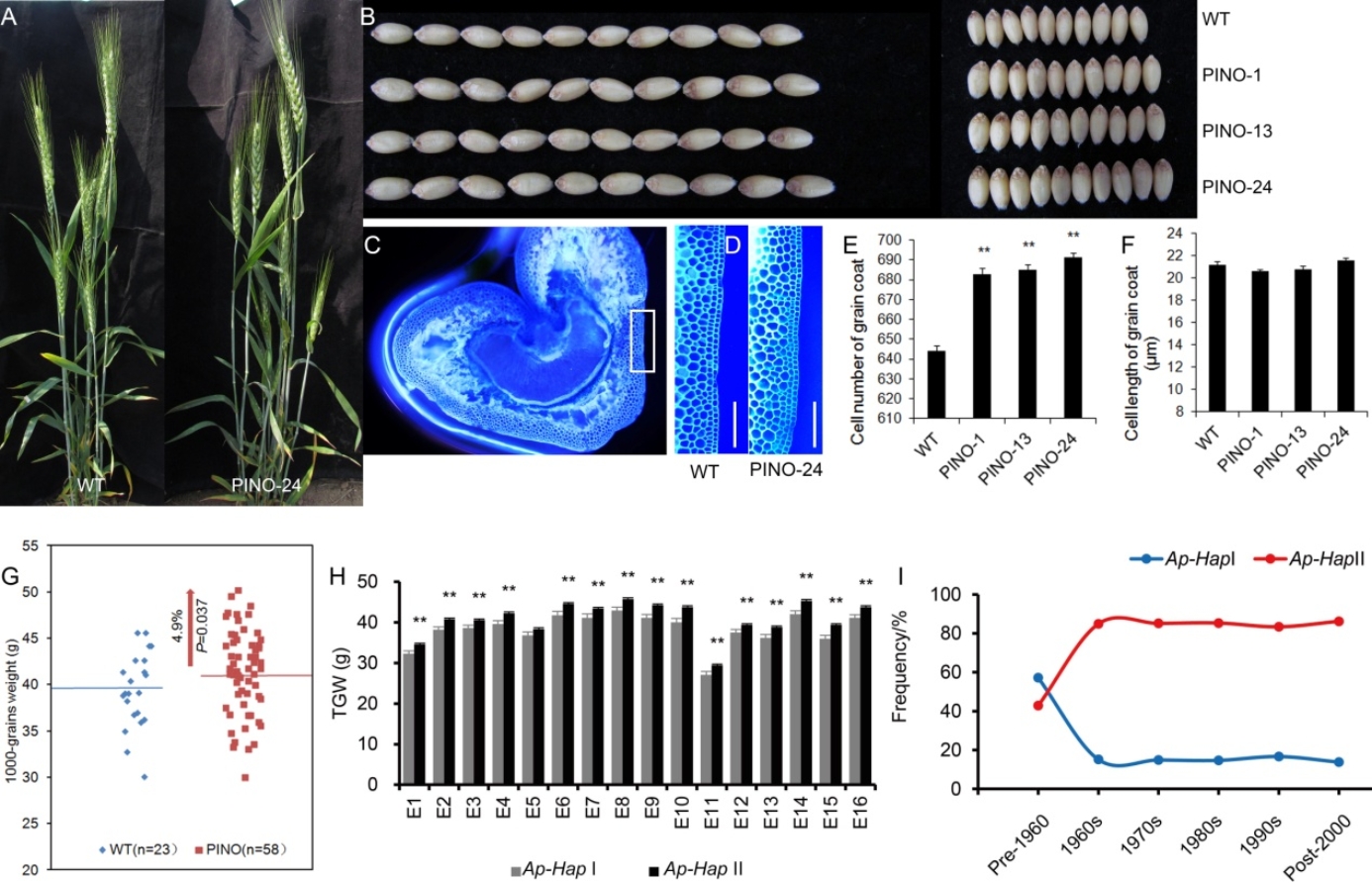 2021年9月,赵惠贤教授研究团队在《Plant Biotechnology Journal》在线发表研究型论文,报道了通过改进TaCYP78A5基因表达模式增加小麦千粒重和单株产量的新方法。提高粮食产量一直是作物育种的首要目标,而增加千粒重是提高作物产量的重要途径之一。该研究首次报道了通过在子房表皮局部过表达TaCYP78A5,能够促进子房生长素积累和母性表皮细胞增殖,增加籽粒增大潜力;避免了TaCYP78A5组成型过表达引起的植株顶端优势加剧、结实降低现象,最终实现了千粒重和单株产量同步增加。研究结果为小麦作物改良和高产分子育种提供了一种新思路。