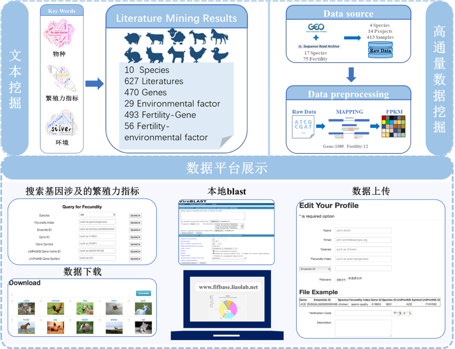2021年1月,廖明帜教授团队在《Briefings in Bioinformatics》杂志上在线发表了题为“FifBase: a comprehensive fertility-associated indicators factor database for domestic animals”的研究型论文。发布了针对家禽家畜繁殖力影响因素的综合数据库FifBase。通过对猪、牛、鸡等十个物种繁殖力相关的高通量测序数据与文本数据整合分析,细致全面地挖掘了与繁殖力相关的基因及其环境因素。在此基础上建立了家禽家畜繁殖力相关基因注释分析生物信息平台,该平台收录了10个物种的繁殖力信息,包含基因的染色体位置、别名、基因结构、基因描述、文本信息、环境因素、基因功能、Pathway通路信息、表达信息、PPI网络、基因组可视化等10余种信息。该平台一方面为家养动物的繁殖育种研究提供数据支撑,另一方面为研究人员探索这些基因的功能及其在畜牧业方面的潜在应用提供了参考。