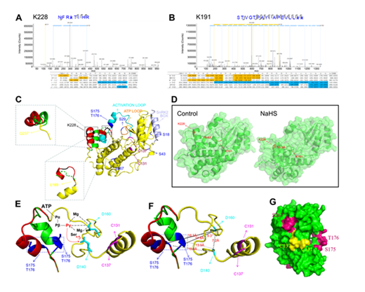 2021年7月,李积胜副教授研究团队在《Molecular Plant》在线发表了研究论文。研究发现气体信号分子硫化氢(Hydrogen sulfide)介导的S-硫巯基化修饰(S-persulfidation)可以改变脱落酸(Abscisic acid)信号通路关键激酶蛋白SnKR2.6的结构,从而提高SnKR2.6转移ATP-γ-phosphate基团的效率,导致激酶活性增强。该研究同时证明,SnKR2.6蛋白关键位点的磷酸化修饰水平可以积极调控硫化氢介导的硫巯基化修饰。该研究提出的蛋白质翻译后修饰互作机制不仅为蛋白质翻译后修饰研究提供新思路,同时也为植物抗旱调控理论依据。