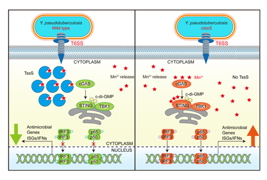 2021年10月,沈锡辉教授研究团队在《PNAS》上在线发表研究论文。研究发现假结核耶尔森氏菌T6SS向宿主细胞转运一个小蛋白TssS,其能够结合锰离子参与细菌对锰离子的获取,并能够增强细菌抗环境胁迫能力和对小鼠的毒力。通过转录组分析发现TssS能够抑制宿主的天然免疫反应,尤其是cGAS-STING信号通路介导的宿主天然免疫反应。鉴于锰离子作为cGAS-STING天然免疫通路的激活因子,进一步研究发现TssS通过螯合锰离子来抑制STING介导的固有免疫反应,以逃避宿主对细菌的清除作用,从而揭示了一种新的细菌免疫逃避策略。本研究不仅对于深入理解病原微生物调节宿主免疫反应的分子机制有重要意义,也将为治疗一些自身免疫系统过度激活引起的疾病提供新的思路。