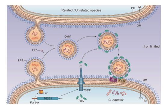 2021年8月,沈锡辉教授与韦革宏教授合作在《The ISME Journal》在线发表研究论文。研究发现杀虫贪铜菌Cupriavidus necator中的六型分泌系统T6SS-1可分泌一个独特的LPS结合型效应蛋白TeoL,通过与OMV表面的LPS相互作用而结合到OMV表面;结合到OMV上的TeoL进一步通过与细菌外膜受体蛋白CubA和CstR的相互作用,介导OMV结合到细菌细胞表面,并最终实现对OMV中包括铁离子等货物的获取。这种铁获取方式不仅对于细菌铁转运领域有重要意义,并为揭示细菌通过招募OMV获取其它营养物质和信号分子的机制带来启示。