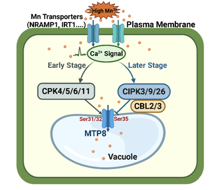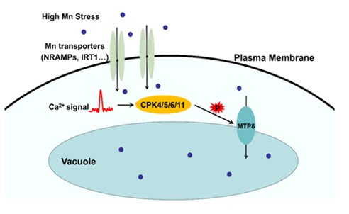 2021年3月,王存教授研究团队在《Molecular Plant》在线发表了研究论文。该研究发现高锰胁迫会引起植物细胞内钙信号,解决了长期以来困扰科学家的疑问。基于此,研究人员进一步研究了钙信号在高锰胁迫中的作用和分子机制。通过系统筛选发现,钙依赖蛋白激酶CPKs家族中的CPK4/5/6/11与定位于液泡膜的锰转运体MTP8物理互作。利用多种蛋白互作技术证明了CPK4/5/6/11与MTP8互作的真实性。最后,通过体内体外磷酸化、酵母功能互补、元素含量测定以及生理表型等实验发现,CPK4/5/6/11通过磷酸化MTP8的第31位和32位丝氨酸激活其转运活性,进而将细胞质中的多余锰离子转运进液泡内,提高植物耐受锰毒害的能力。研究成果为培育有益重金属超富集作物和有毒重金属低积累品种提供了理论依据和技术支持。