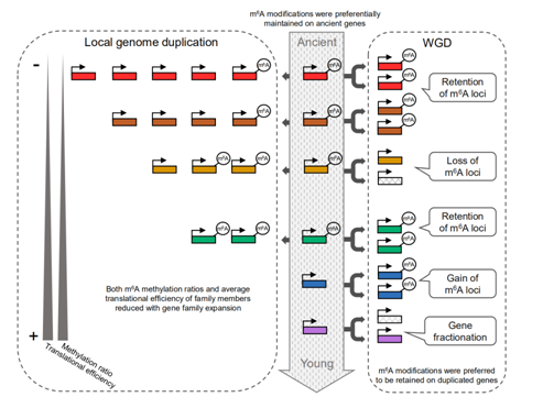 2021年10月,马闯教授研究团队在《Molecular Biology and Evolution》在线发表研究论文。揭示了植物RNAN6-甲基腺苷修饰(m6A)在古老同源基因起源和进化过程的偏好性,及其在全基因组加倍和局部基因组复制过程中的进化特征。研究人员以小立碗藓、拟南芥、玉米、水稻、小麦等13种具有代表性植物物种为对象,构建了对应的RNAm6A修饰全转录组图谱,以跨越5亿年进化时间的尺度对数据深入分析,发掘出植物m6A 修饰在进化中的保守性和分化特征。该研究表明,伴随着植物物种的进化过程,m6A 修饰偏好性地保留在进化起源古老的直系同源基因中;相对于新产生的基因,早期进化起源的直系同源基因对之间的m6A 差异更小;全基因组复制后的序列变异和局部基因组复制事件导致的基因家族扩张是引起同源基因间m6A 修饰差异的重要因素;同源基因间m6A 修饰的差异影响了基因组复制事件产生的重复基因的转录水平和翻译效率的变化。