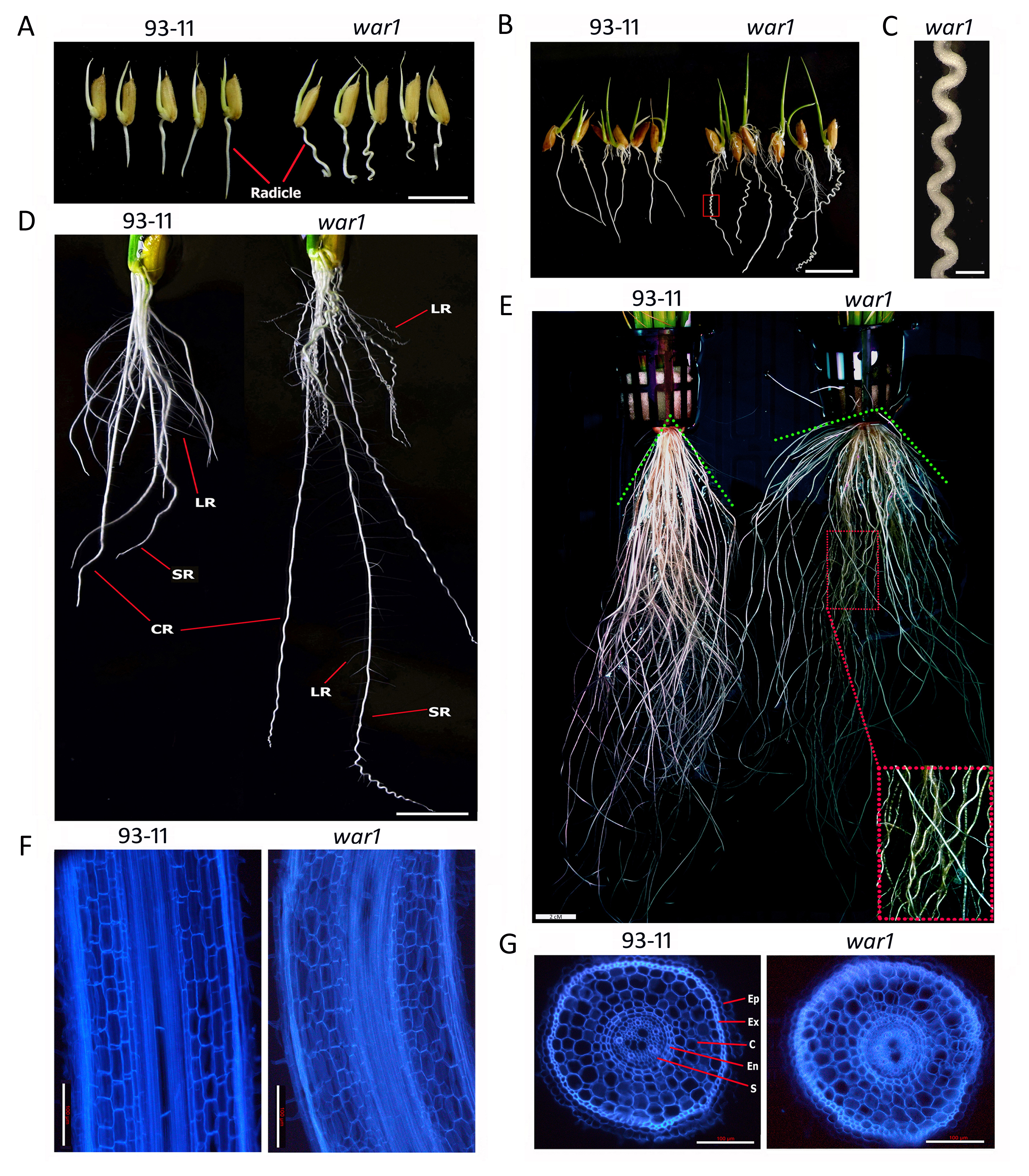图1 水稻war1突变体产生根系波浪状卷曲表型