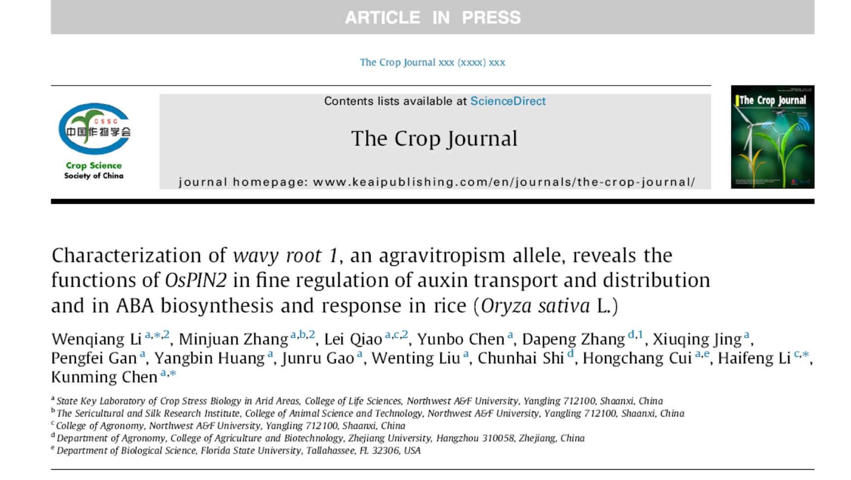 近日,公司陈坤明教授团队在The Crop Journal在线发表了题为“Characterization of wavy root 1, an agravitropism allele, reveals the functions of OsPIN2 in fine regulation of auxin transport and distribution and in ABA biosynthesis and response in rice (Oryza sativa L.)”的研究论文。该研究报道了生长素转运蛋白OsPIN2通过精细调控根尖生长素转运和极性运输从而控制根向地性感知,并通过作用于ABA信号途径影响种子萌发和根的生长发育等过程。