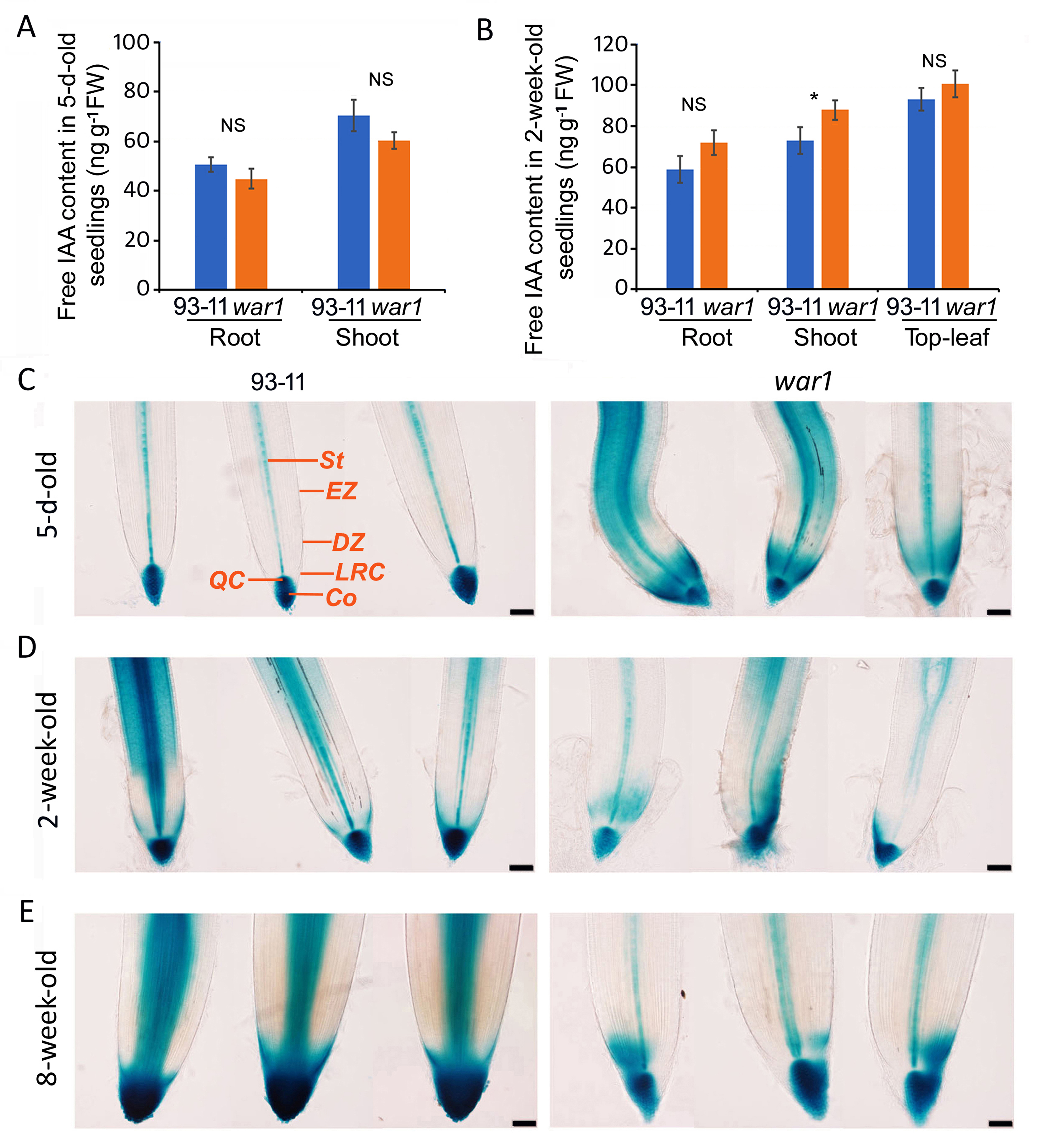 图2 水稻OsPIN2功能缺失导致war1突变体根尖生长素转运和分布紊乱