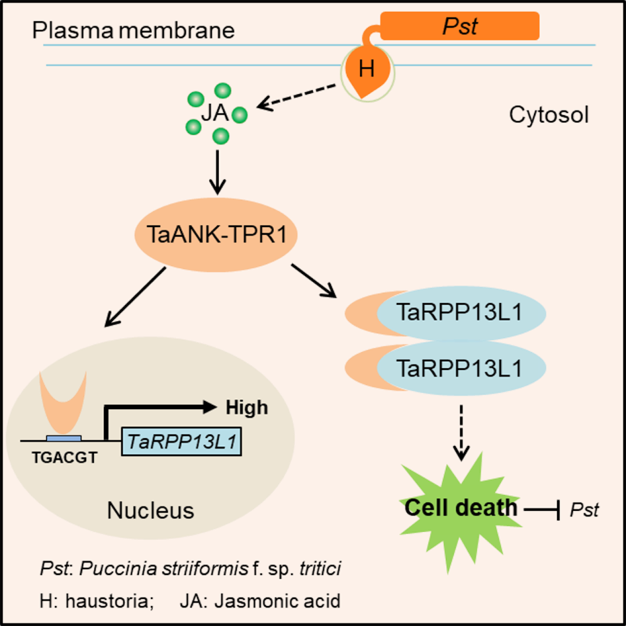 更重要的是,过表达 TaRPP13L1 能够在不影响田间重要农艺性状的情况下,显著降低小麦条锈病流行时的产量损失,为农作物抗逆遗传改良提供了重要的依据和种质资源。综上所述,TaANK-TPR1能够响应条锈菌侵染及JA信号,通过调控NLR基因TaRPP13L1的表达,并在蛋白层面与之互作,通过促进其二聚化从而激发强烈的细胞坏死,最终增强小麦对条锈菌的抗性。
