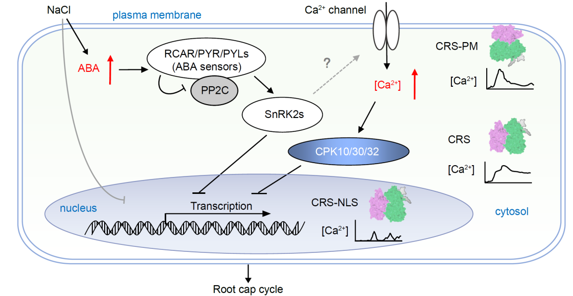 在该研究中,作者开发和使用具有纳摩尔级别和大动态范围的遗传编码比率型Ca2+指示剂(CRS)可视化了ABA在不同器官和细胞类型中触发的Ca2+浓度变化。具亚细胞器定位的CRS揭示了始于细胞质膜、到细胞质再到细胞核振荡的具时空分辨率的特异性Ca2+信号。ABA通过受体PYR/PYLs和SNRK2.2,2.3,2.6激活了纳摩尔级的Ca2+浓度变化。根冠通过感应环境刺激和触发各种趋向性,在保护干细胞生态位和调节根的定向生长方面起着至关重要的作用。从细胞分裂到脱落,根帽的快速精确更新对于植物适应不同的环境条件至关重要。盐胁迫抑制根系伸长并改变根系生长方向,钙水平增加是对盐胁迫的早期反应。这种动态的周转过程使根帽能够有效地管理和应对环境挑战,保护干细胞生态位和最佳的根生长和发育。作者进一步发现盐胁迫会明显抑制根冠细胞的生长和脱落。在根尖细胞盐胁迫诱导ABA累积进而诱导了低浓度纳摩尔级别的Ca2+浓度变化进而激活CPK10,30,32蛋白激酶,抑制决定细胞命运的关键转录因子以及对根冠成熟和脱落相关的酶表达。作者的研究揭示了盐害抑制根冠周期,而ABA-Ca2+-CPK信号途径参与并调节根冠周期的可塑性,以适应不利环境。