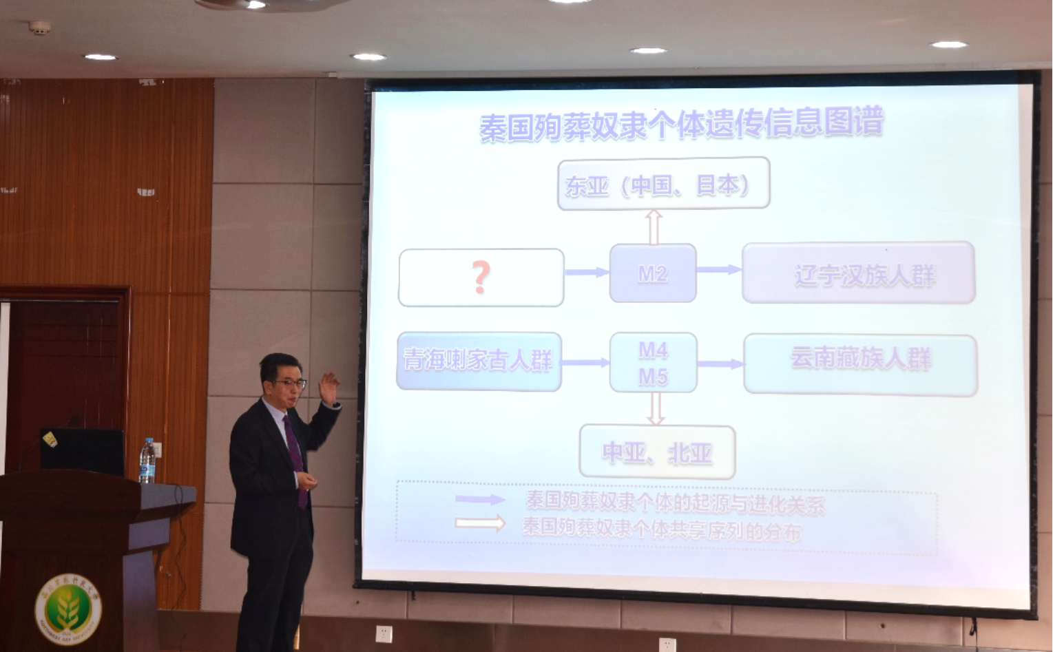 张教授进一步介绍了其团队通过提取遗址中古人类DNA,应用自主设计的基于mtDNA遗传信息聚类分析区域人口结构的方法,对陕西范围内的宝鸡凤翔秦国殉葬奴隶墓葬群进行古人类遗传关系的研究。研究分别将秦国殉葬奴隶与中国现代人群、其他古代人群进行序列比对,为解读秦国的社会人口结构与群体的历史发展过程提供了分子证据。研究团队还对榆林靖边五庄果墚新石器时代人类遗址进行了研究,结果显示五庄果墚古人类与现代南方汉族人群亲缘关系较近,印证了现代南方汉族起源于北方的观点;而且研究还表明新石器时代五庄果墚古人类对山东和新疆古人类以及日本人都有一定的基因贡献。